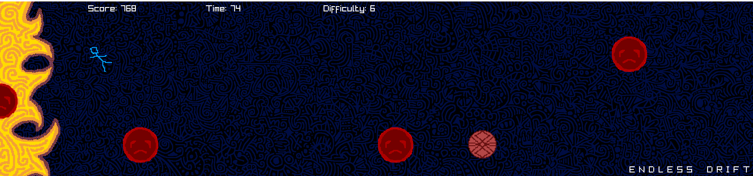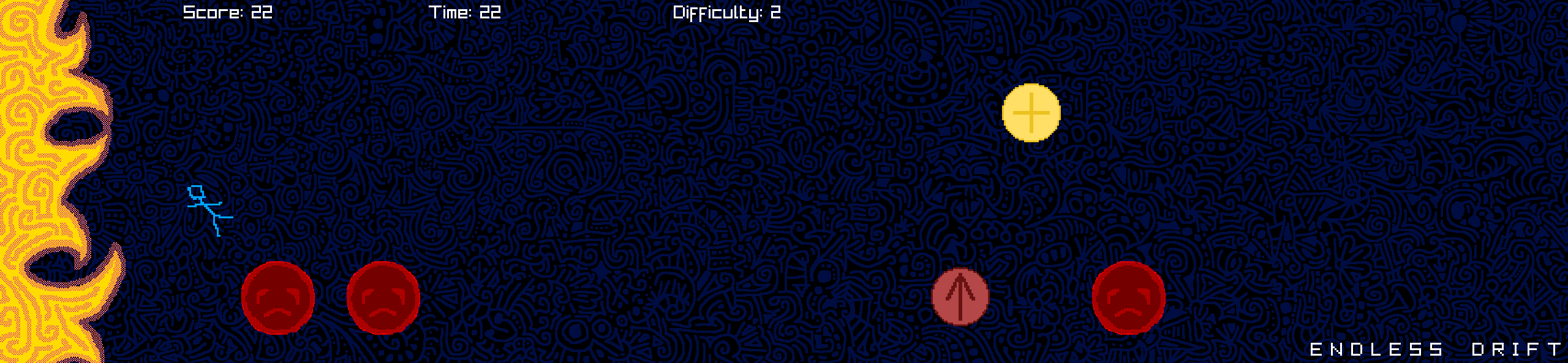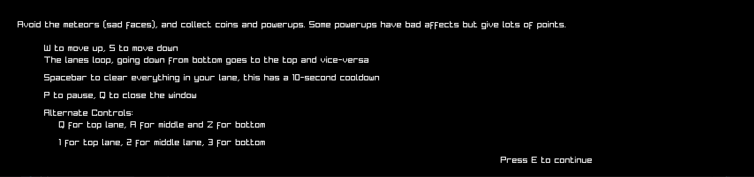 Move between three lanes dodging meteors (The sad lookin' guys) and grabbing powerups while the difficulty gradually increases.